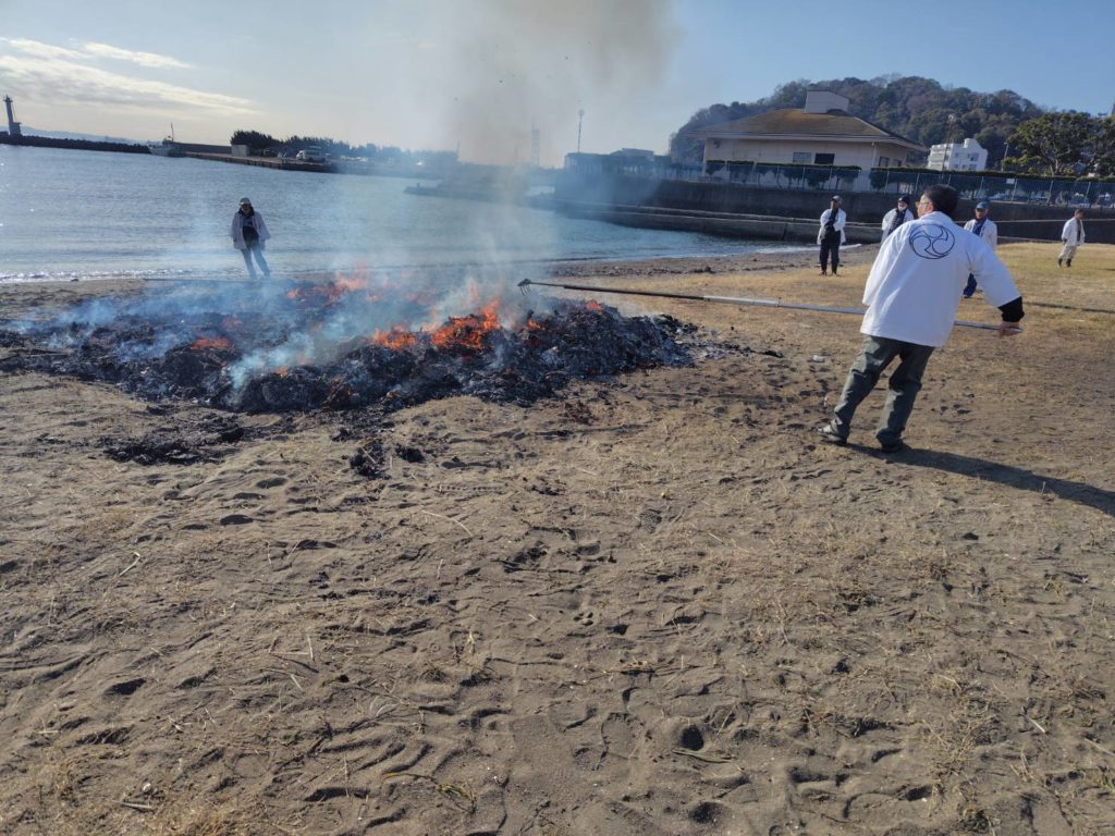 1月15日鴨居八幡神社前の海岸で行われた齋燈(どんど焼き)です。早朝の朝8時点火ですが、多くの人々がつめかけてくれました。