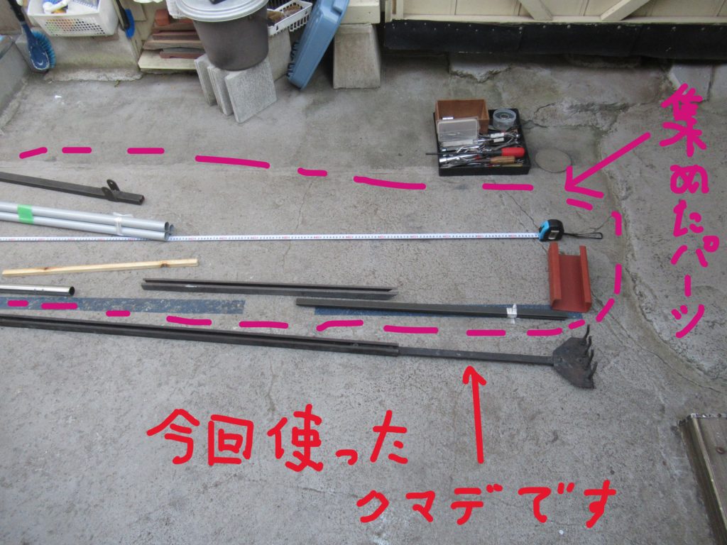 火の勢いが無くなってきて見た目には燃え尽きたかなと思えても、鉄製のクマデでほじくり返すと燃えていない物が出てきます。今回使用したクマデ4本のうちの1本は、私が自宅にある材料でDIYした物です。このクマデが予想以上に活躍したので、もう1本作ってみることにしました。