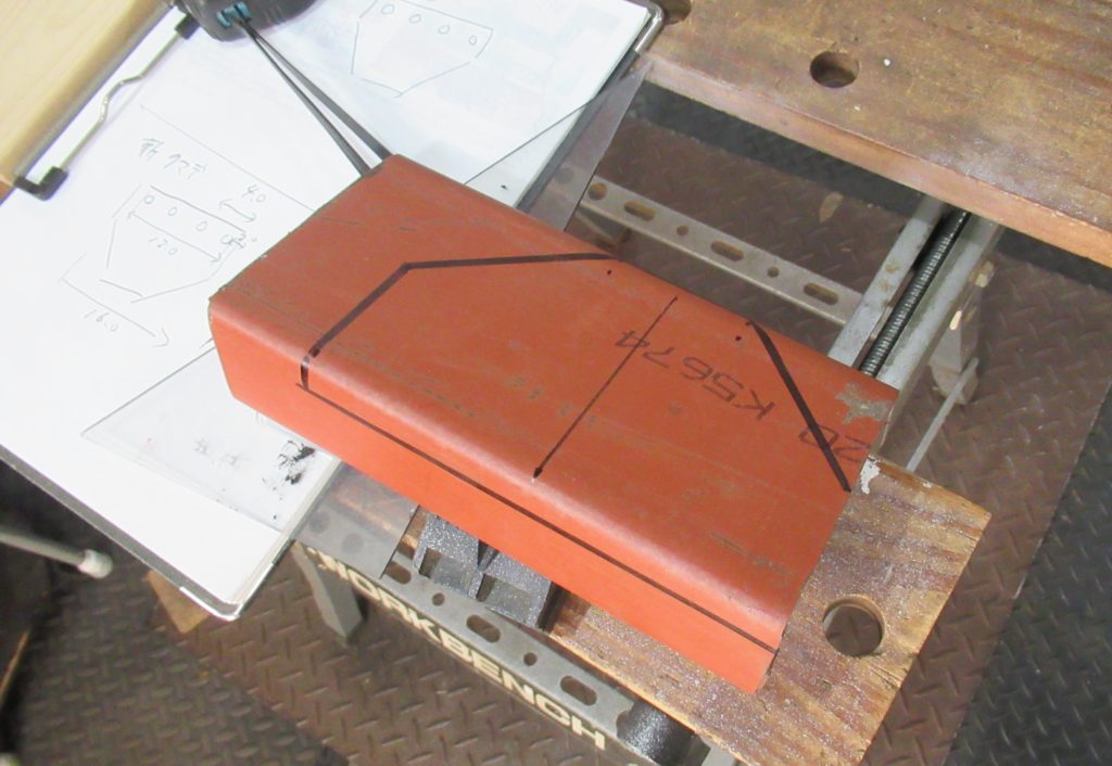 最初に自作したクマデに使った鉄板と同じ物がもう一つありました。コの字形をした肉厚の茶色い大型鉄板です。2本目のクマデは少し大きく作るつもりです。あまり大型にすると重くなってしまい使いづらくなるので、バランスを考えながら鉄板にクマデにする線を引きました。