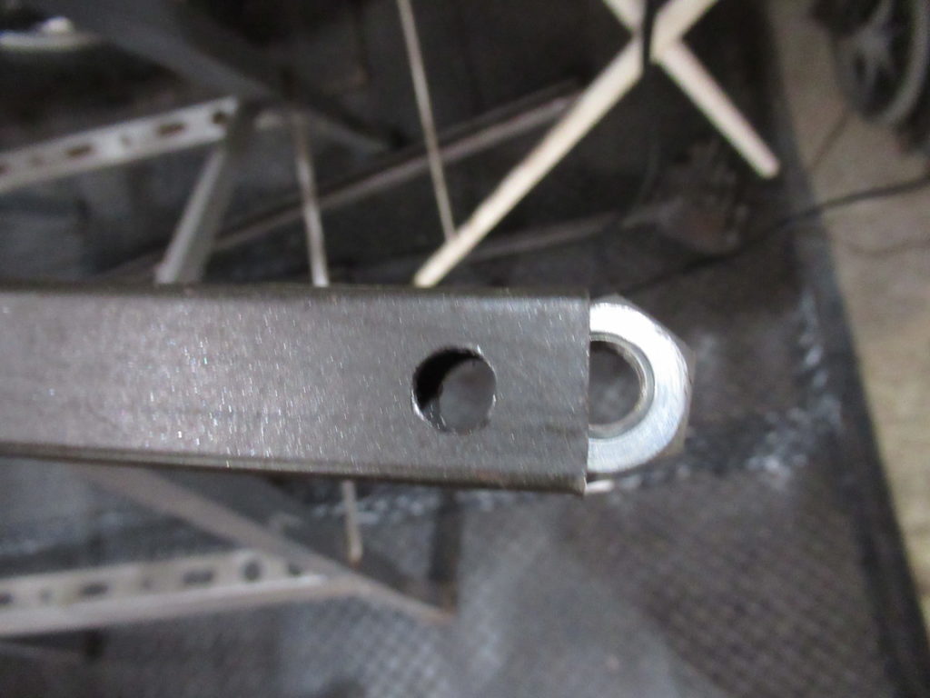 支柱にする鉄棒は中空になっています。このまま支柱に開けた穴にボルトを通して締め付けると支柱がつぶれてしまう恐れがあるので、鉄棒の穴を開けた位置にナットを押し込みました。