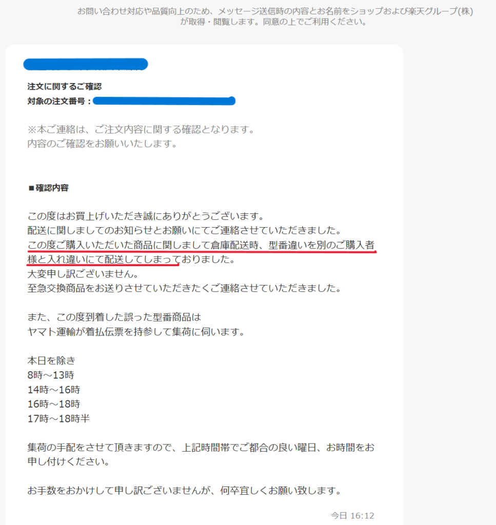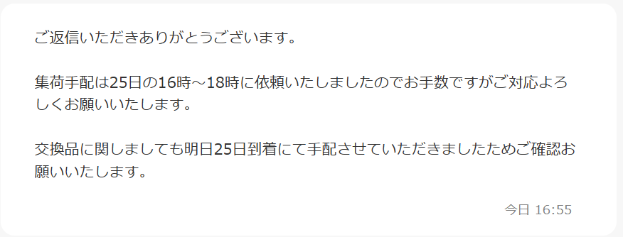 誤って届いた型番違いの商品の集荷手配希望は、確実を期すため翌日ではなく翌々日の25日16時~18時とショップに連絡しました。