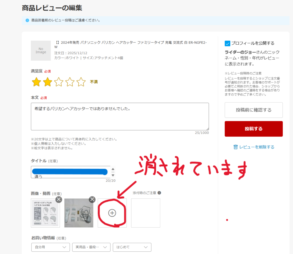 「商品レビューの編集」を再度確認すると、私が商品紹介の間違いを指摘した画像と私のコメントが削除されていました。よほど、店にとっては都合の悪いレビューだったようですが、全く誠意を感じません。