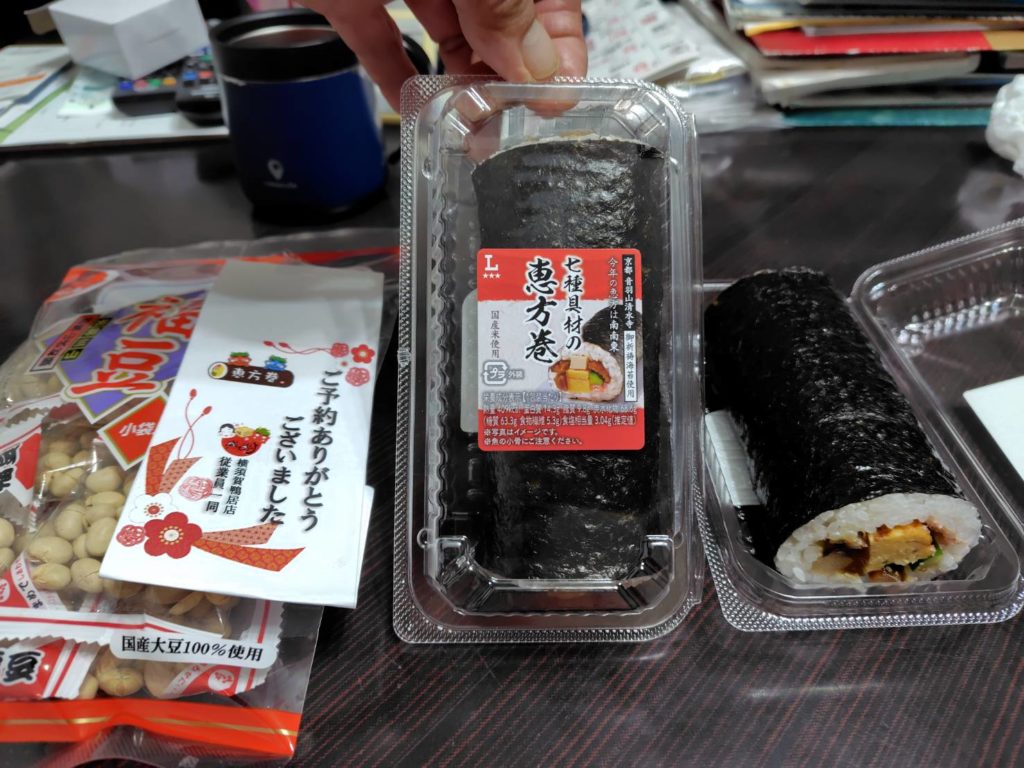 一昨日は節分でした。我が家では七福神にあやかって、7種類の縁起がよい食材が入った「恵方巻き」を頂きました。恵方巻は、その年の恵方(縁起が良いとされる方角で今年は南南東)を向いて、会話をせず無言で、1本食べきりました。