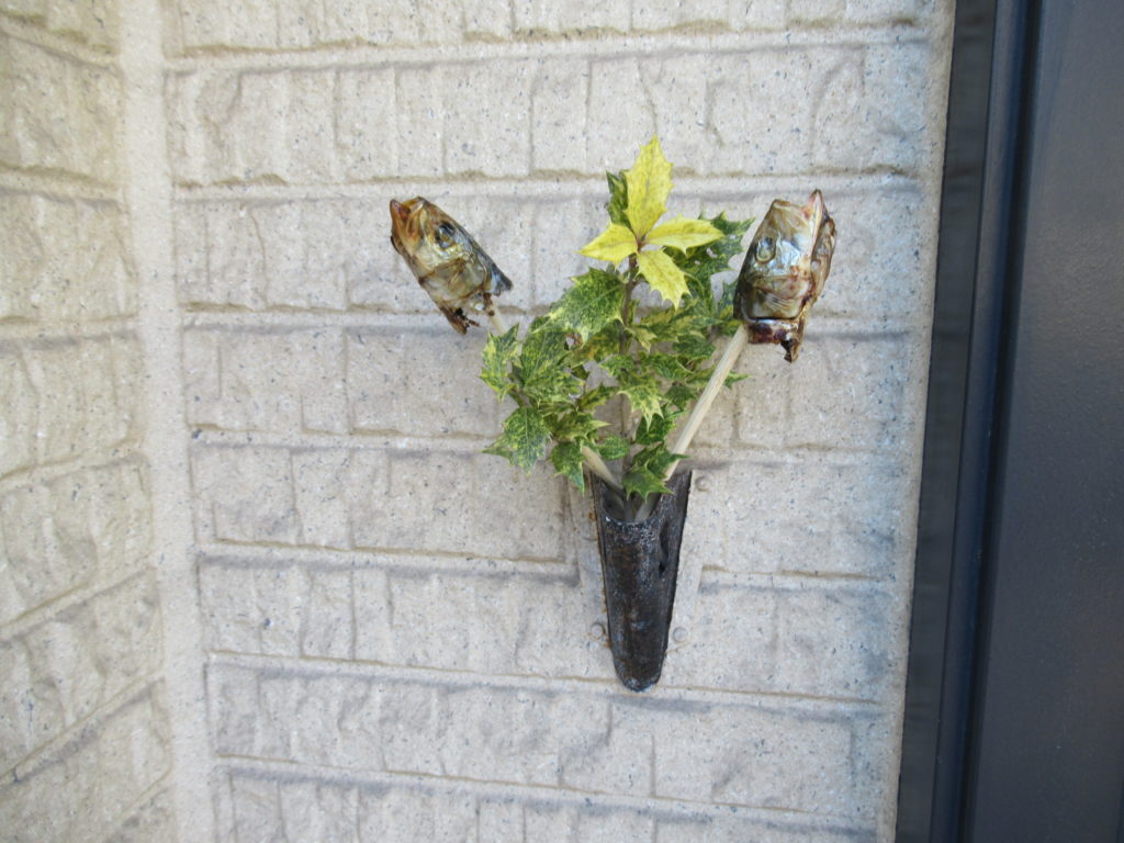 玄関にはいわしの頭とひいらぎの葉を設置しました。これはただの飾りではなく、鬼が嫌がる臭いがするいわしの頭と、鬼が嫌いな尖ったトゲのあるひいらぎの葉を組み合わせて飾ることで「鬼が家に入って来ないように」という魔除けの意味合いが含まれています。