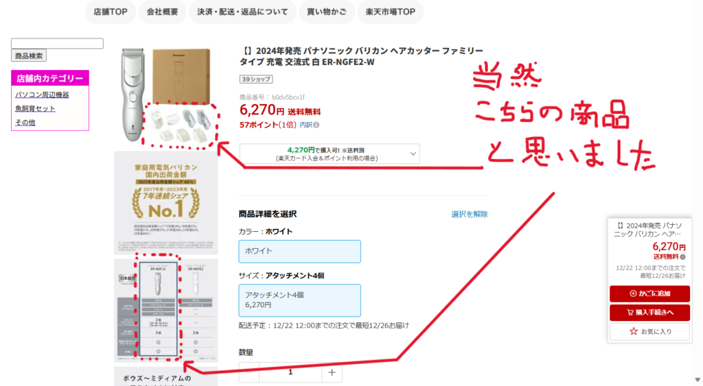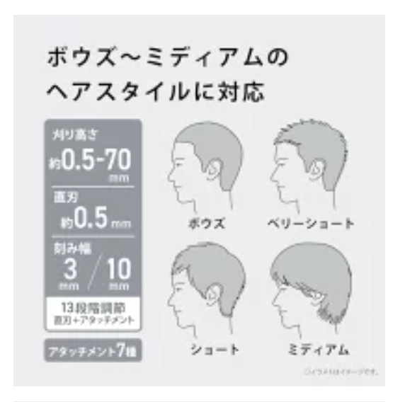 商品紹介をよく見てみると、自宅に届いた商品の品番は「ER-NGFE2-W」で、この商品紹介に書かれていた品番と同一です。しかし、商品が2種類提示されていますが、この品番の商品は右側のものです。そして、この商品紹介では左側の商品に青線で囲みがしてあり、写真上部のアタッチメントもボウズからミディアムまでの6種類が付属されているように表示がありますが、これは左側の商品の紹介です。 明らかに間違いな商品紹介です。