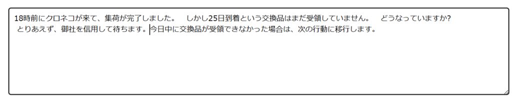 25日になり、18時過ぎにクロネコが来て、誤って届いた型番違いの商品を受け取っていきました。しかし、正しい商品がいつになっても届きませんでした。