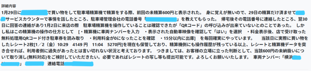 昼過ぎに問い合わせのメールをレシートの写真と一緒に送信しました。すると夕方、自宅にこの精算機の会社から電話があり、私の問い合わせ内容や今までの私の精算機使用履歴を調べた結果、今回の「前回の未精算600円」は取り消したので、支払いはありませんと連絡を受けました。