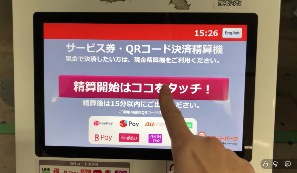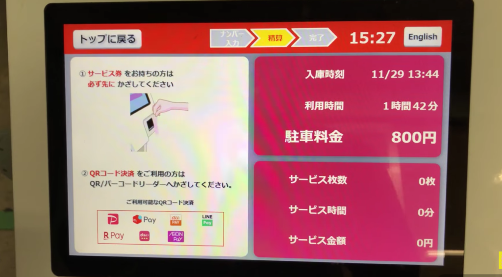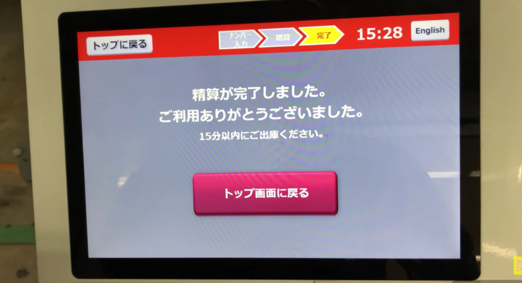料金が0になり精算が完了しましたの表示を確認後、速やかに15分以内で出庫しています。