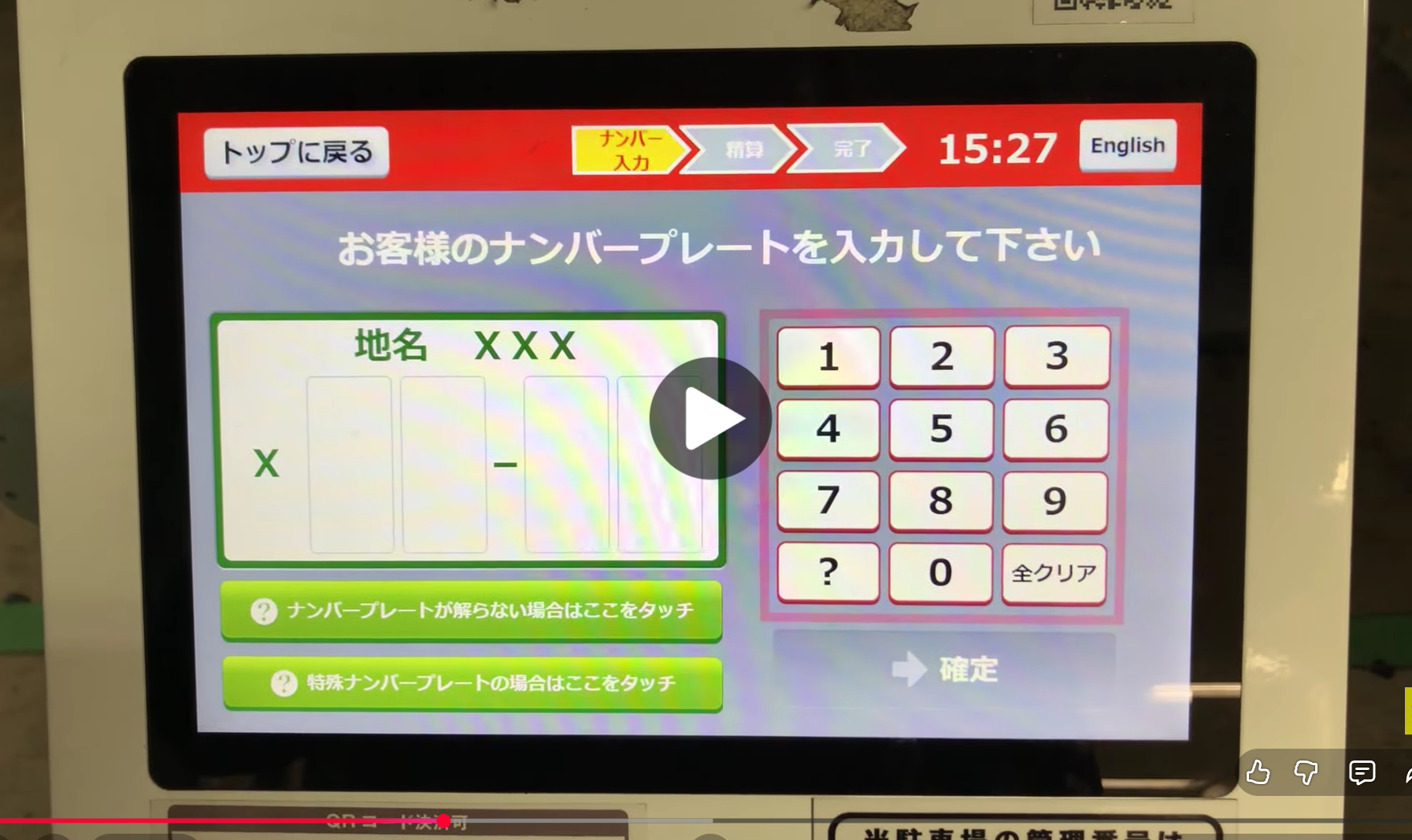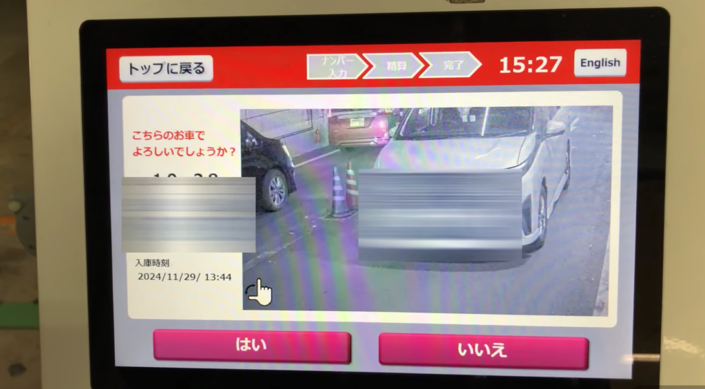 マイカーのナンバープレートを入力する清算方法は最近多くなっていますね。 入庫する際、駐車券を受け取る手間が無い代わりに、精算機で精算しなくても出庫できてしまって、後から多額の料金を請求される恐れがあります。 まだ完全な清算方法では無さそうなので、私は疑っていました。そのため、駐車料金の精算をする時は、毎回同じやり方を繰り返して確実に精算が完了するように気を付けています。 その方法とは、まず駐車場出口付近にある精算機の画面をタッチします。
