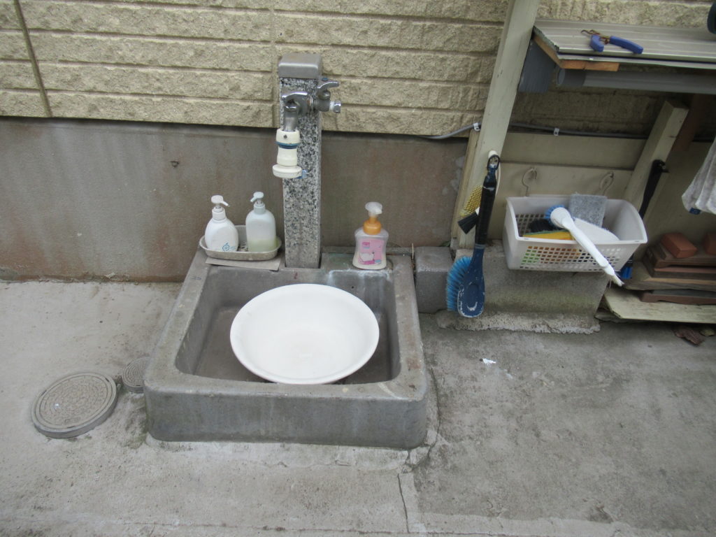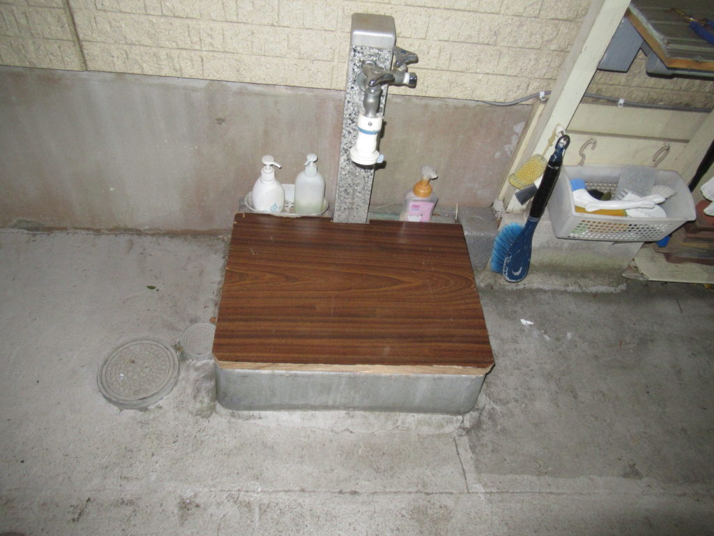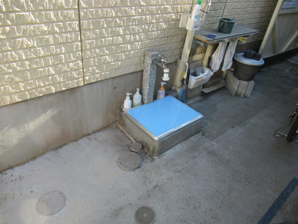 ベニヤ板を使って、防水処理をしたカバーが完成しました。これで、強風時近隣の住宅から庭木の落ち葉などが駐車場に入り込んでも、ガーデンシンクに入り込むことが防げるようになりました。ではまた