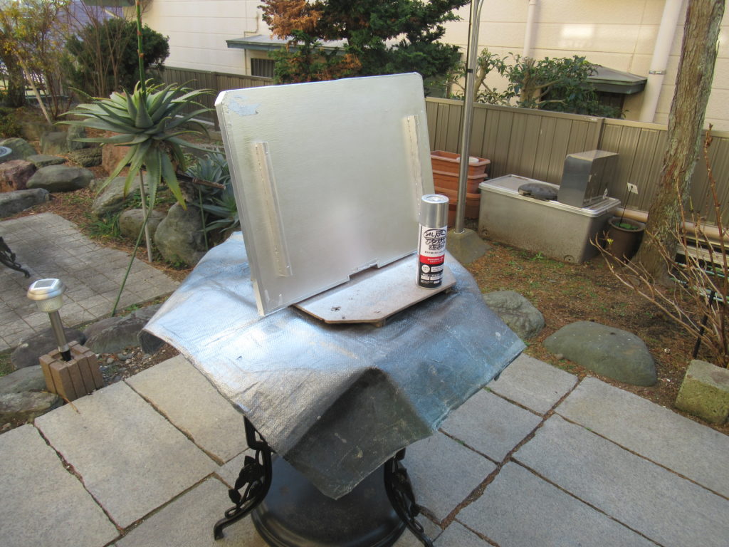 カバーの下面は塗装することで防水性を確保します。シルバーのスプレー塗料を使って下面全体を塗装しました。カバーの下面には、設置中ずれないように木材のパーツを取り付けました。