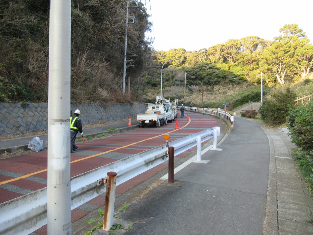 横須賀観音崎付近で作業車が何かの作業をしています。