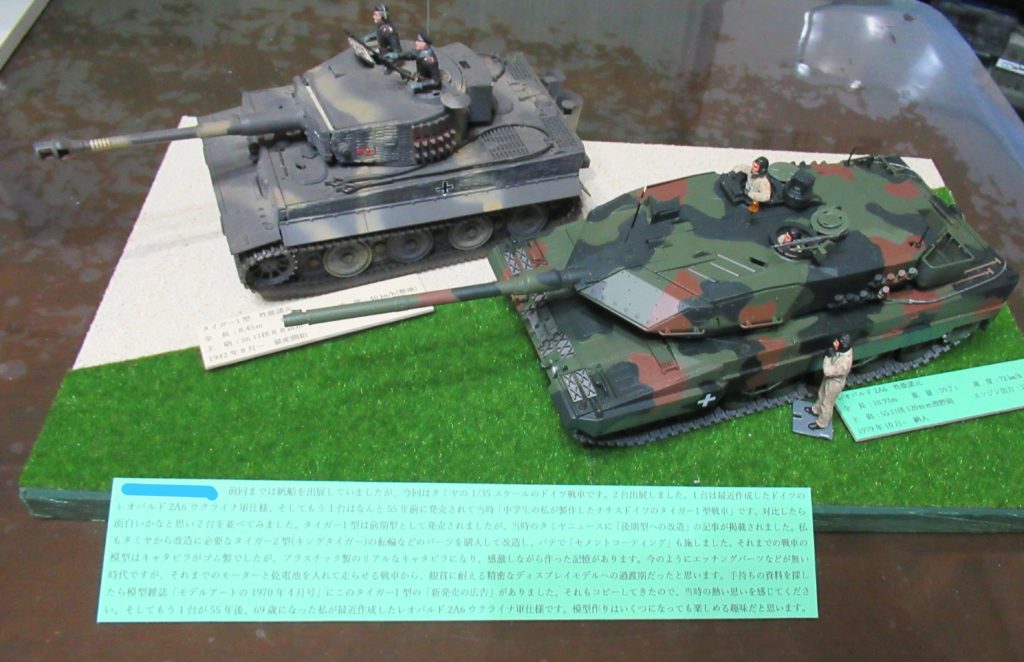 市内衣笠の老舗模型店「おもちゃの王様」では、コロナから模型コンテストを取りやめて毎年8月から1年間、店主催の模型コンテスト歴代1位の受賞者の模型を展示しています。私は帆船模型を3回3年間展示させて頂き、昨年8月からはドイツ戦車レオパルドⅡウクライナ仕様と50年前に制作した大戦中のドイツタイガーⅠ型戦車を展示させて頂いています。