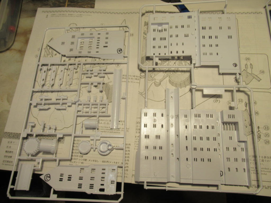 建物のパーツは白色で着色されています。しかし、このままではプラスチック特有の「透明感」があり、重厚なイメージはありません。当然着色を考えました。