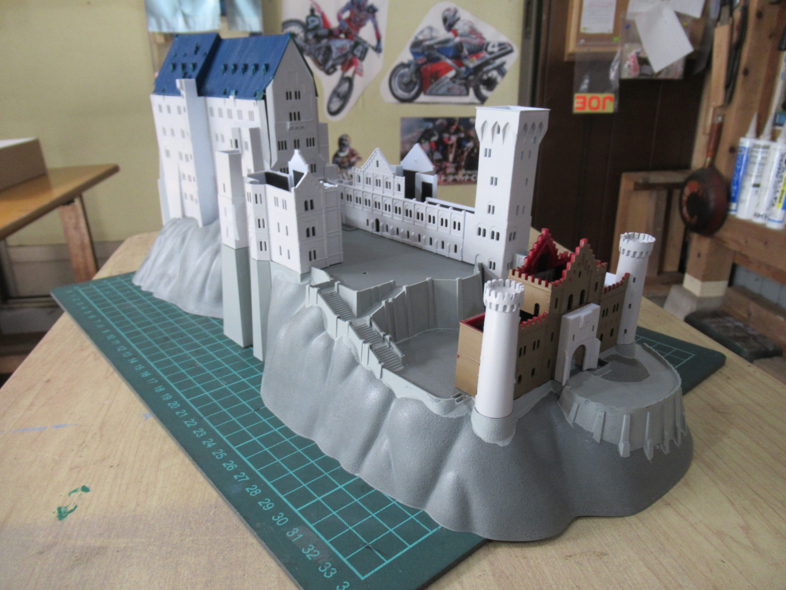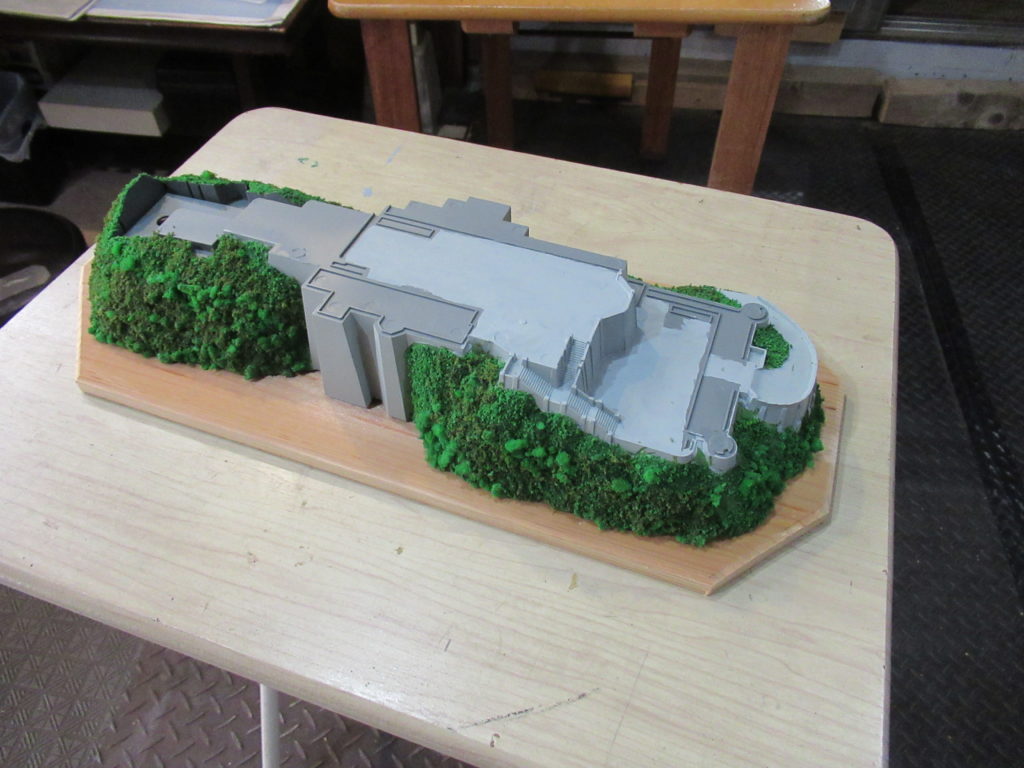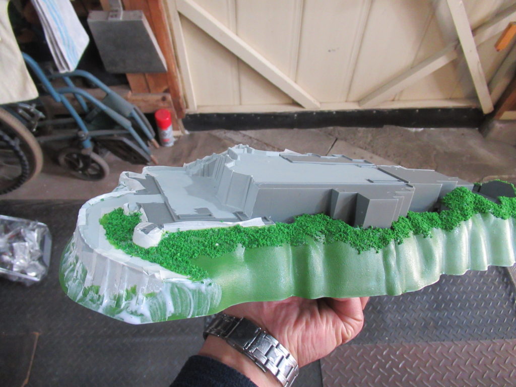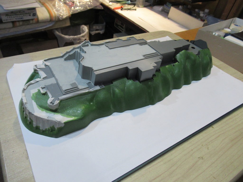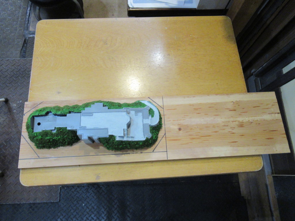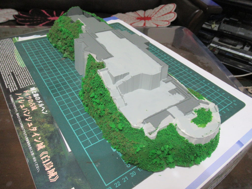 土台の上にお城のパーツを仮組みしてみました。全体のイメージが湧きます。屋根の塗装まで終わりました。今回は土台の塗装や草木を貼り付けるまでの作業をします。