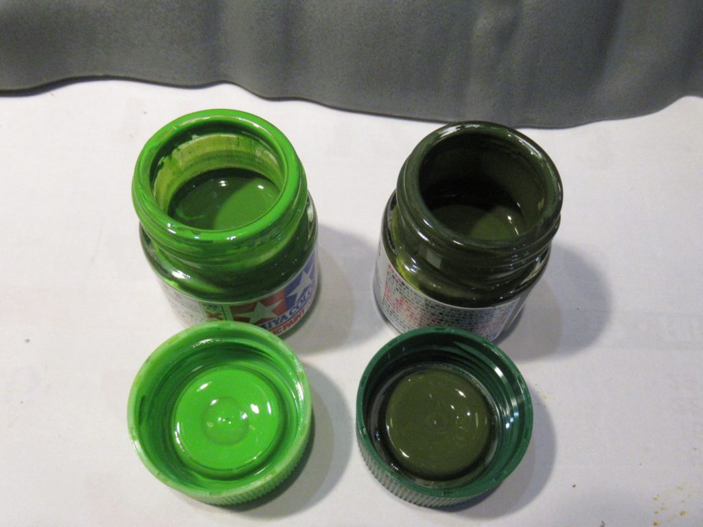 塗料の種類が豊富なミスターカラーとタミヤカラーから、草木が生い茂る土台に合う色を探しました。 イメージしたグリーンの色にピッタリの塗料がありませんでした。そこでタミヤカラーのこの2色を混ぜて、ピッタリ合う色にします。つや消しにするため、フラットベースを混ぜました。