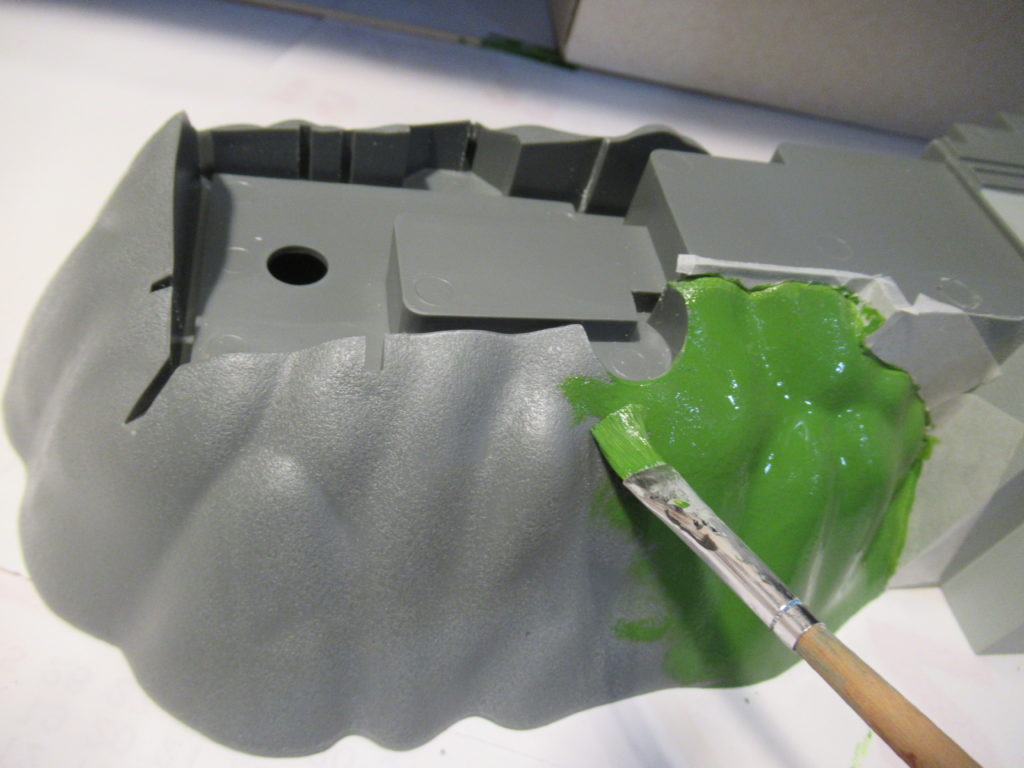 混ぜた色を筆塗りします。写真ではライトの影響で明るい黄緑色になっていますが、実際はもう少し暗い色です。