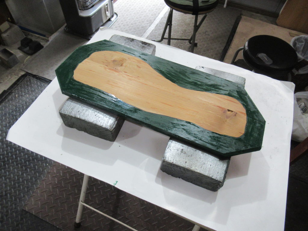 仕上がった土台を木の台に載せてみました。これでも良いのですが、もっと木の板と土台を馴染ませたいです。