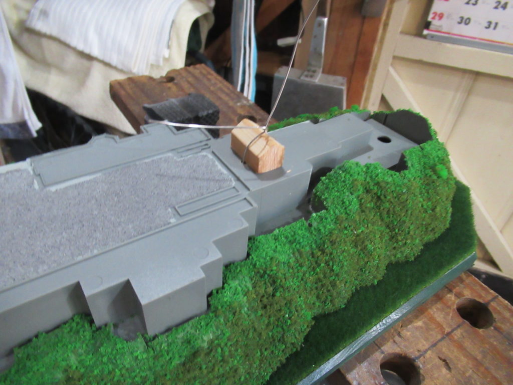 フェイクモスシートを貼った板にお城の土台を取り付けます。通常は両面テープやボンドで接合しますが、お城の土台が長さ40㎝以上の大型が原因なのか、若干反ってしまっています。このため、今回は針金を使って両方を強く結合することにしました。こうすればお城の土台が押さえつけられるので、反り返りが修正されて、板と土台の間に隙間ができません。