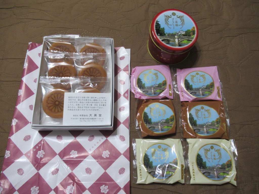 土産はお饅頭と二重橋の写真の丸い缶に入ったゴーフレットです。皇室らしいデザインのお土産に喜んでくれました。ではまた