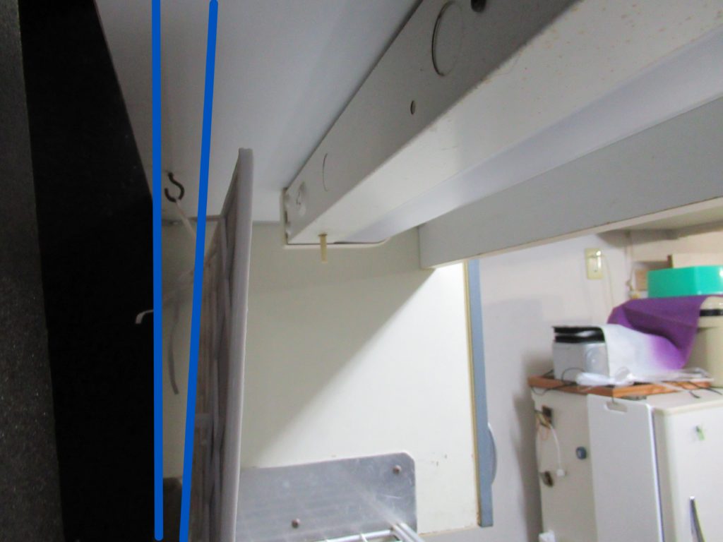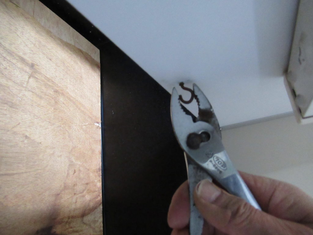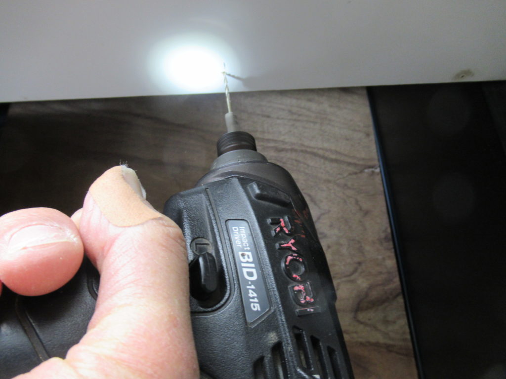 シンク上部の照明器具を付けている木製の棚に、フックを付けます。ドリルで穴を開けました。