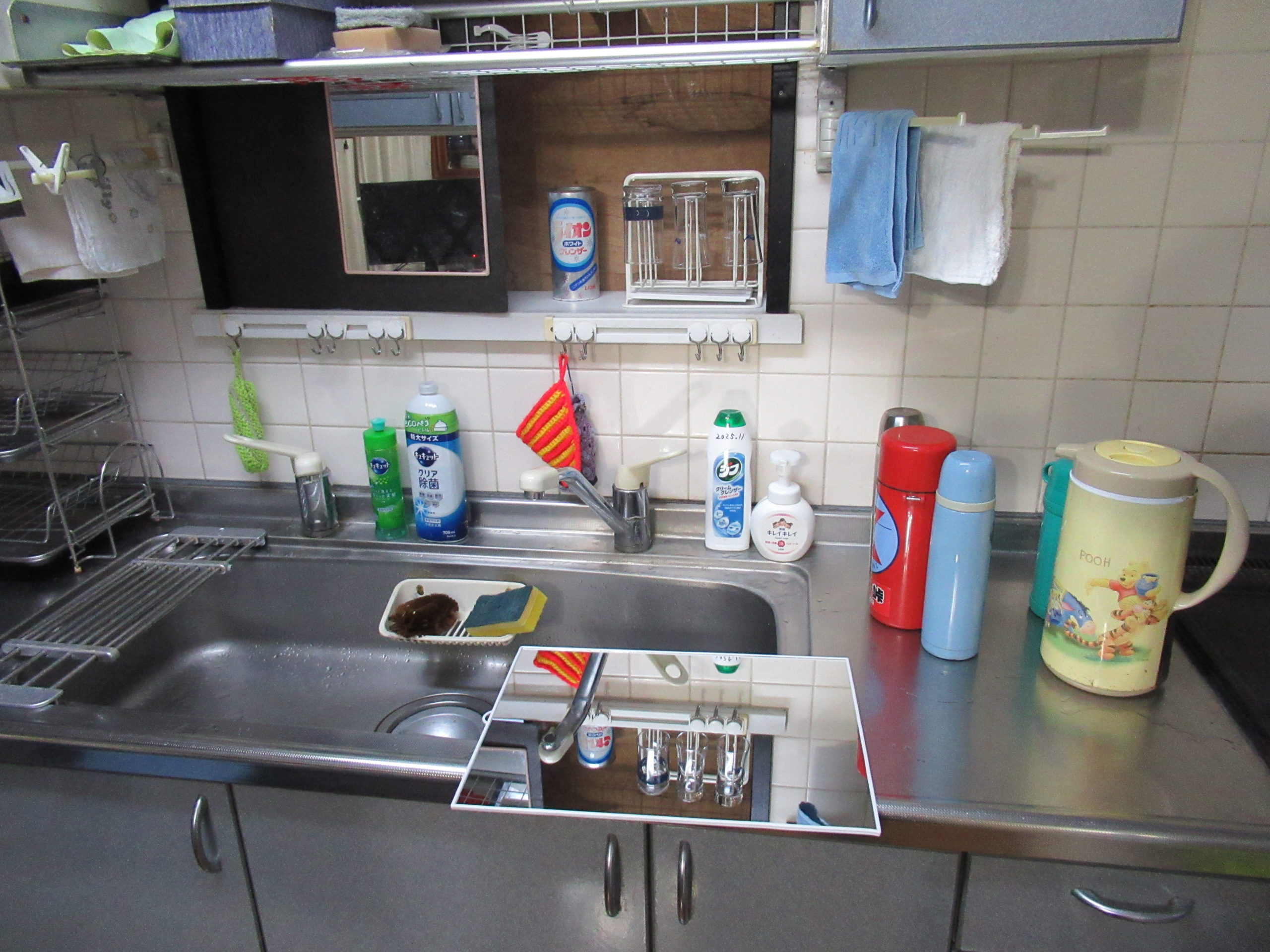我が家は妻と二人暮らしです。基本は妻が2階の洗面所やトイレ、私が1階の洗面所やトイレを使います。しかし2階でお湯を使おうとすると給湯器からの距離が遠いため、お湯の温度が安定しません。特にお湯を使っている途中でも、ちょっとお湯を止めて洗顔の作業をしてから再びお湯を出す時に、2階の洗面台では温度が変化します。 1階洗面台のお湯の方が、温度が安定しているので、妻が洗顔の時に1階の洗面台を使います。他の用事では2階洗面台も使いたいようなので、私の歯磨きは1階シンクですることが度々です。そのため、鏡を設置しました。私にとってちょうど良い高さに棚があるので、その下に鏡を設置しましたが、もっと高い位置にも鏡が欲しくなりました。