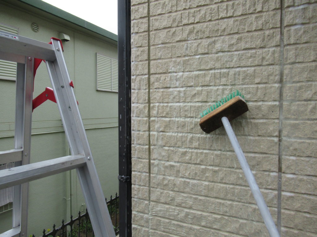 デッキブラシに洗剤を浸けて、雨水で濡らした外壁を擦りました。