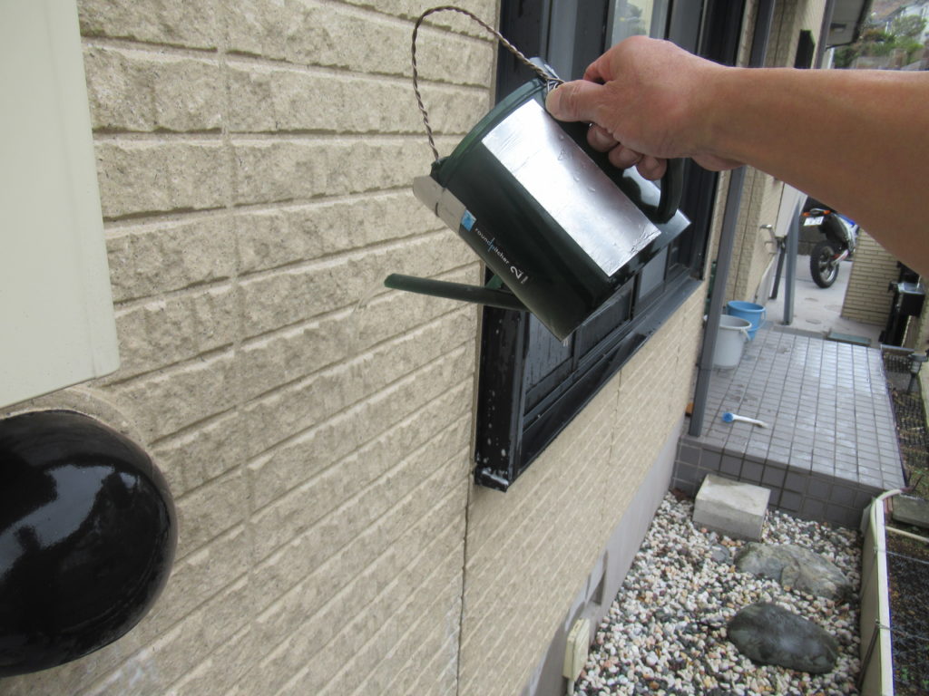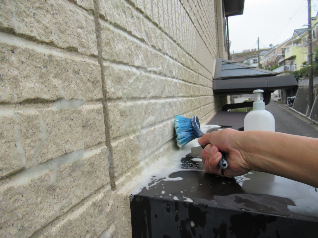 ブラシ洗剤で擦り、綺麗になった外壁に残った洗剤を雨水で洗い流しました。