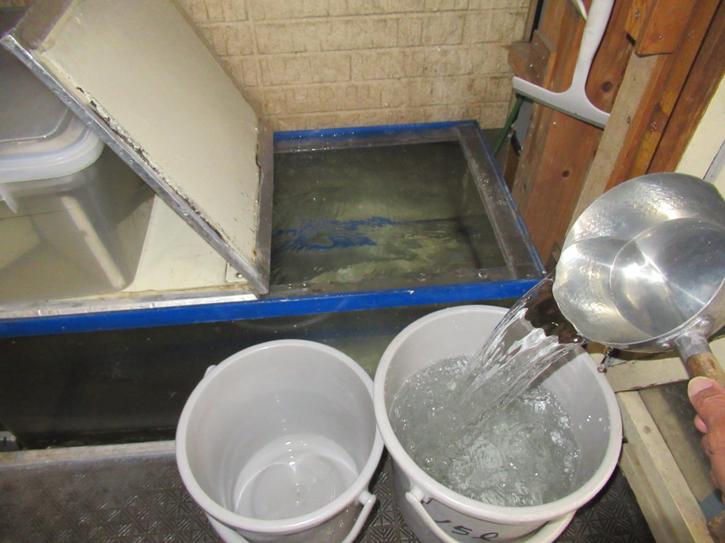 溜まった雨水をバケツに移しました。この水で外壁の清掃をします。