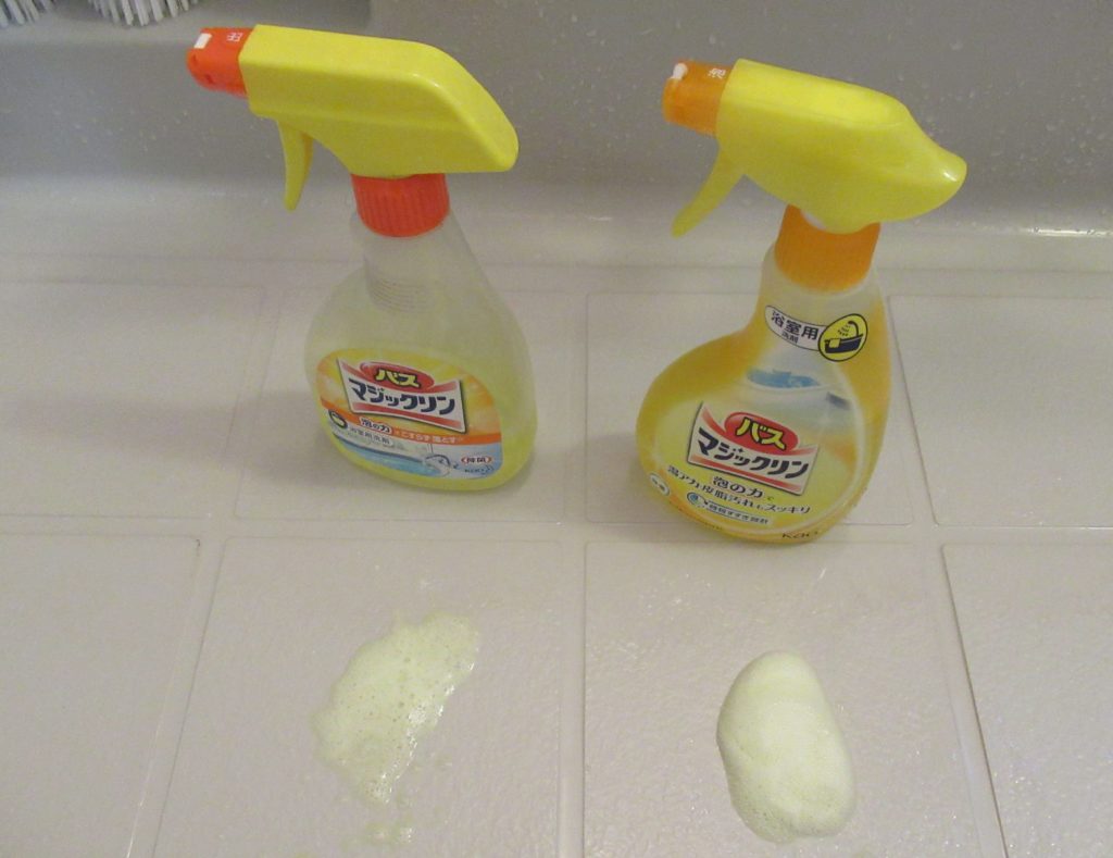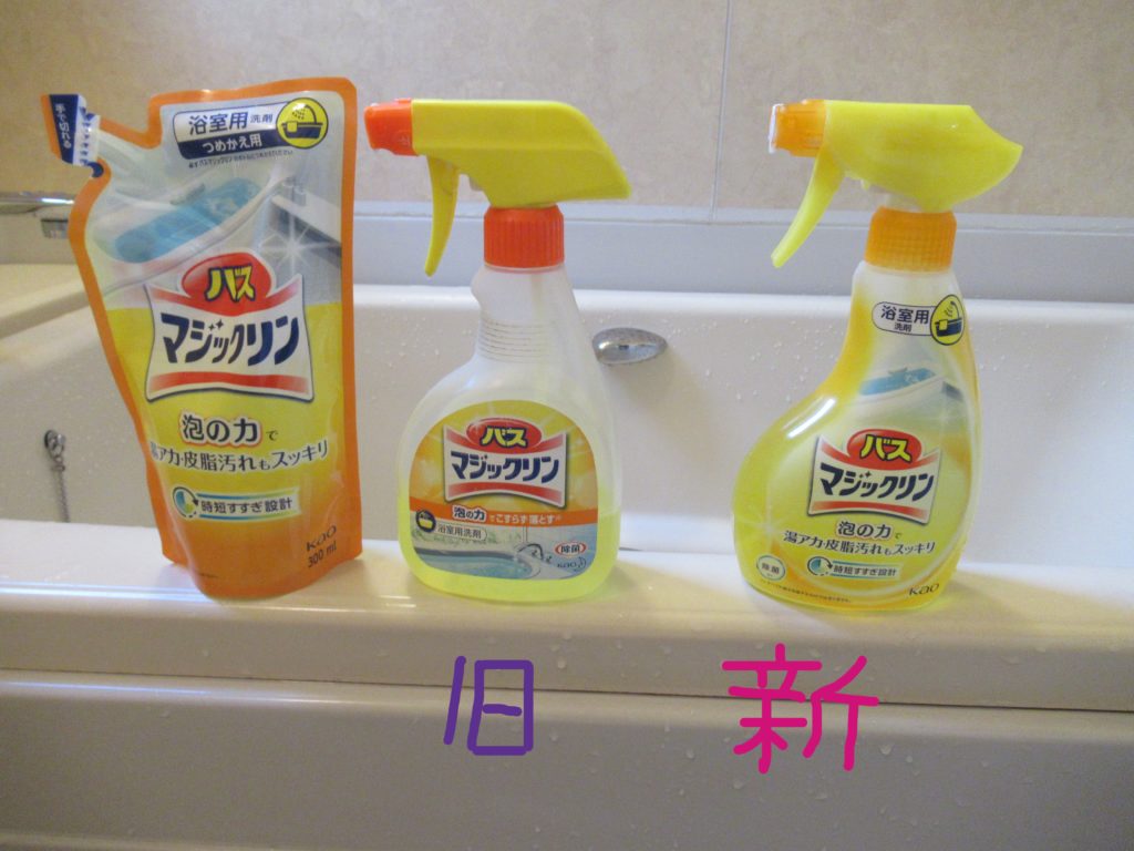 最近、浴室の清掃に使っているバスマジックリンのレバーの戻りが悪くなりました。 いつも洗剤液が無くなると、「詰め替え用」を購入して容器に補充していました。振り返ってみると、一度も容器を買い直おした記憶がありません。数十年使い続けていたようです。そこで、新しい容器を購入しました。使い続けた容器と並べて比較してみました。容器の形状とラベルが違いますね。